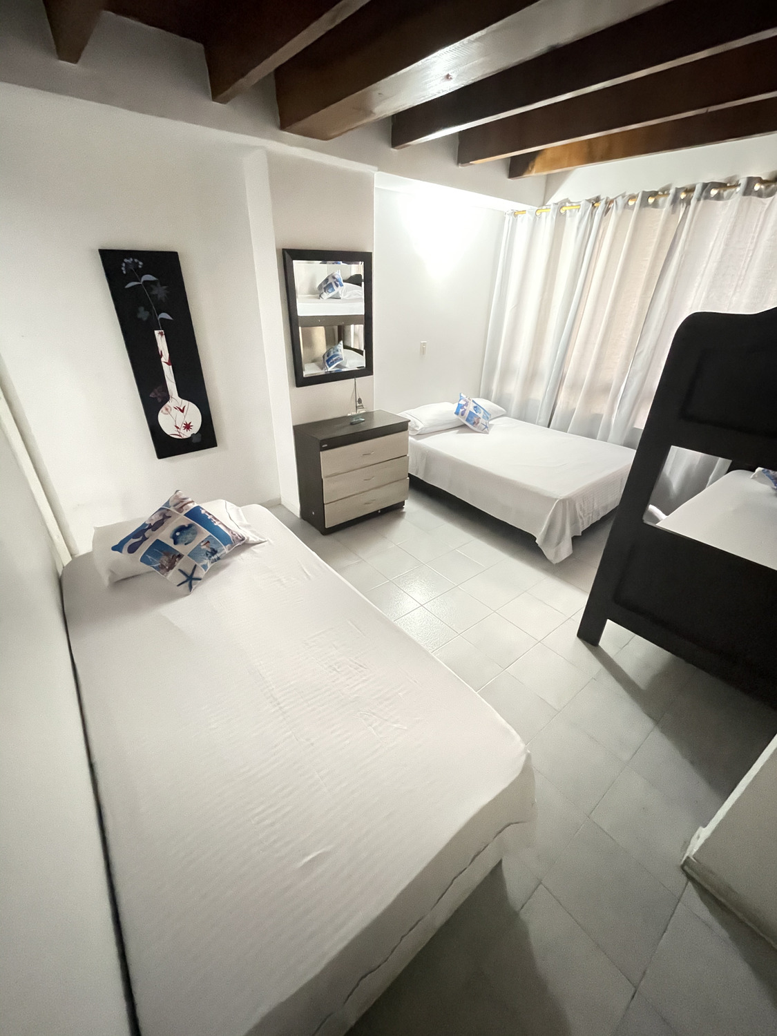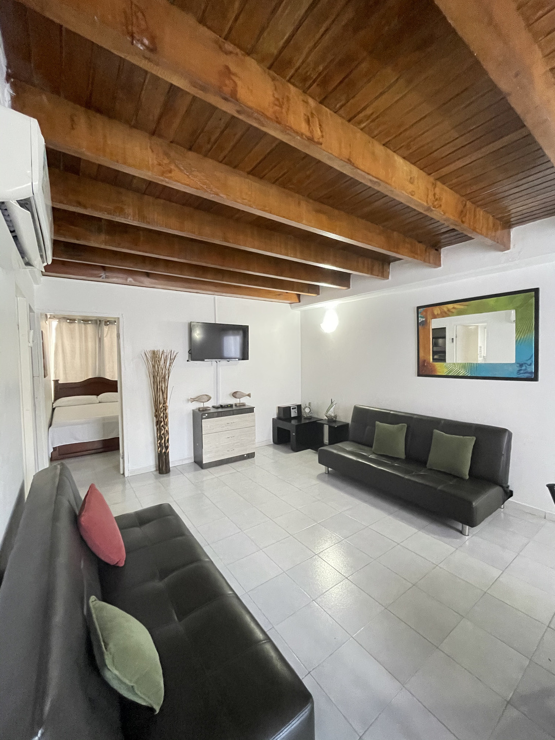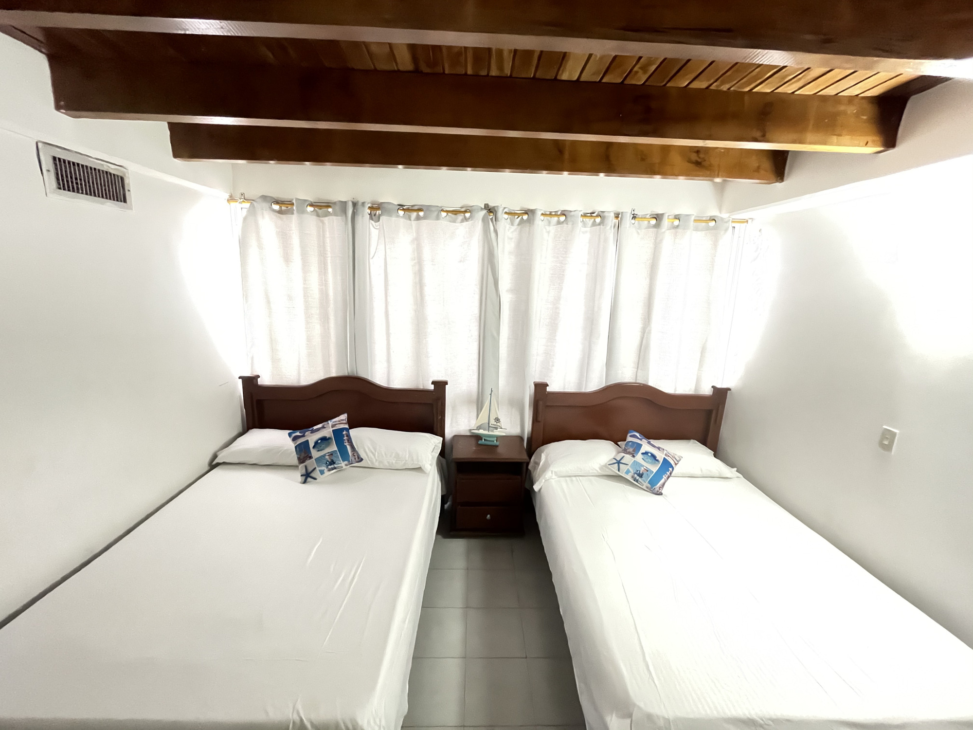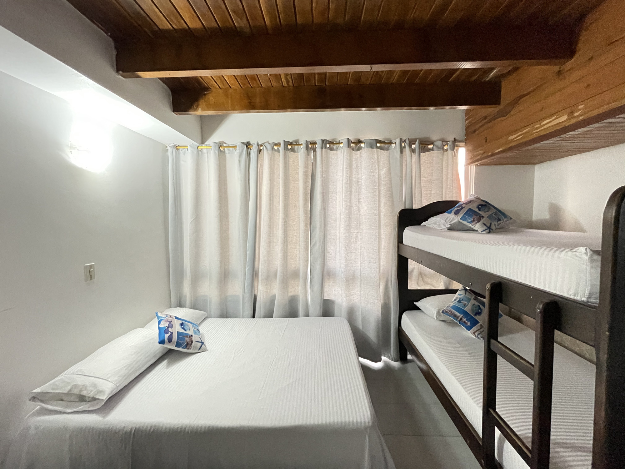 Cada habitación tiene aire acondicionado, closet, ropa de cama; cuenta con cocina, equipada con electrodomésticos, vajilla y batería de ollas.
